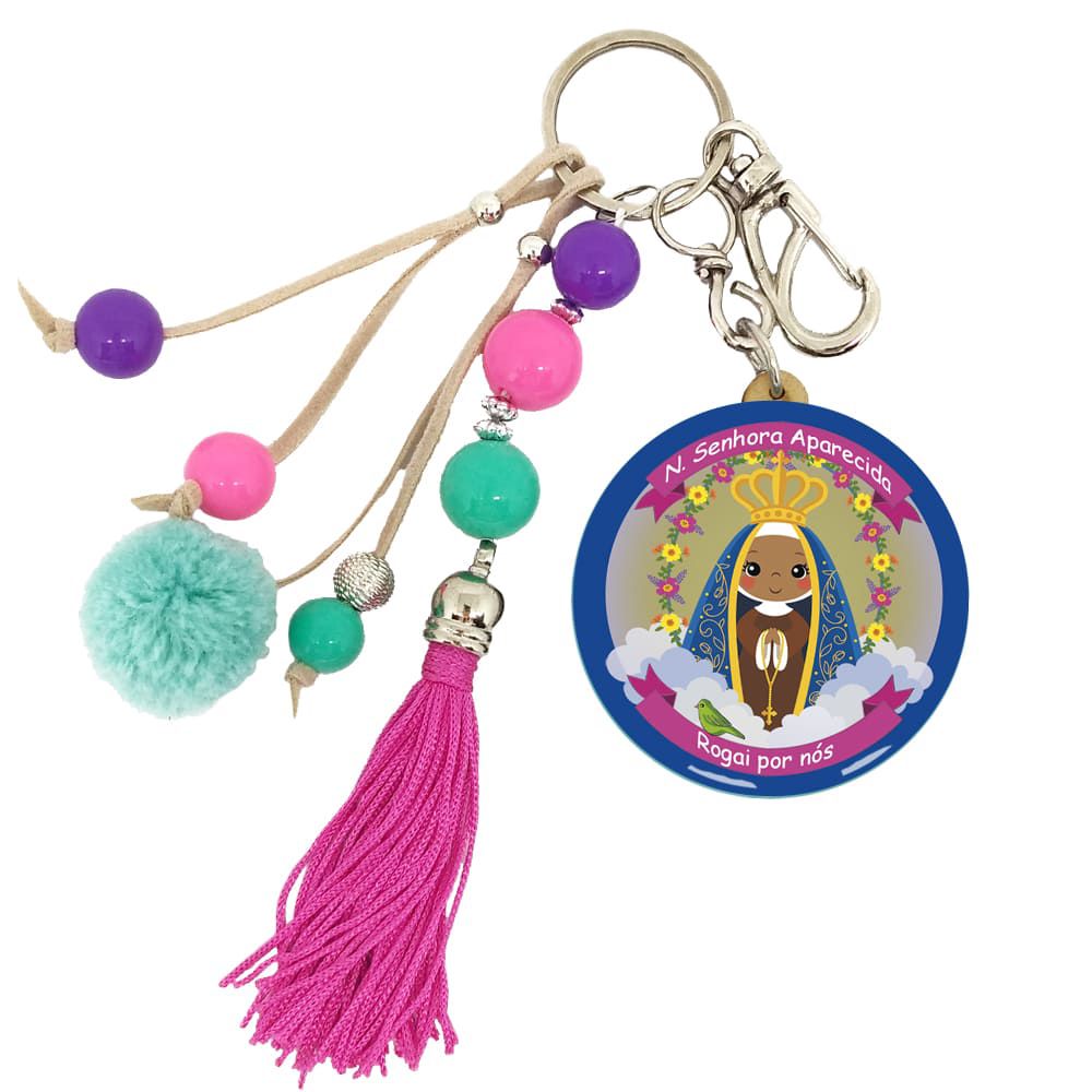 O Chaveiro Nossa Senhora Aparecida vem uma franja de seda, pompom e vários pendulaques*. Além de um mosquetão (gancho) para prender o chaveiro na bolsa, mochila, etc.